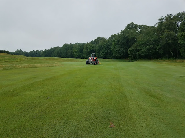 Check out the picture below. After aerifying, removing the plugs, filling the holes with sand, and brooming, the finished product on #1 approach looks pretty good.